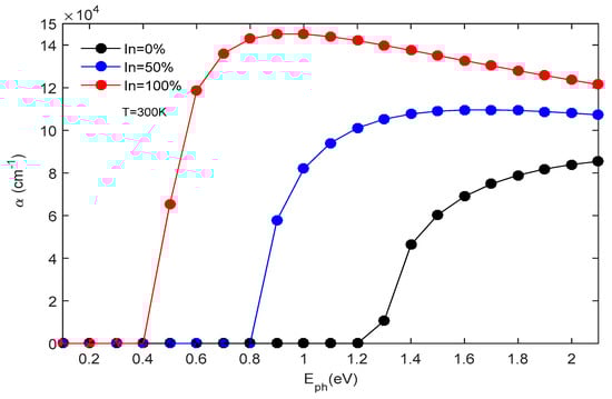 Figure 7 illustrates how the energy of incident photons and strain (ε) affect the α of the GaInAs structure at room temperature (Equation (16)). The absorption spectrum is observed to range from 0.4 to 2 eV. Additionally, variations in strain significantly impact the α of the component’s active structure. For instance, at a strain level of +3%, indicative of high strain, the optimal α is around 9.14 × 104 cm−1. Conversely, at a strain level of −3%, representing compressive strain, the optimal α increases to about 1.40 × 105 cm−1. This simulation aids in identifying the α that aligns with the most stable and efficient structure. Our findings indicate that the most stable configuration occurs at ε = 0, corresponding to an α equal to 105 cm−1.