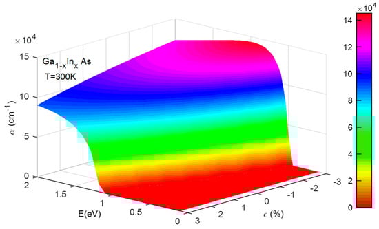 The influence of photon energy and strain on the absorption coefficient of the GaInAs structure at temperature of 300 K.