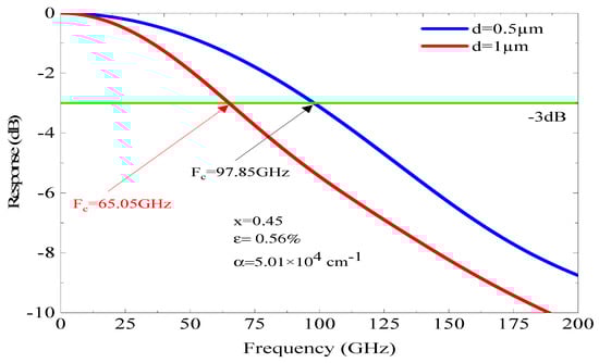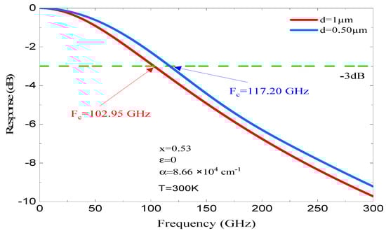 Figure 8 and Figure 9 illustrate how the fc changes with the thickness of the absorber region for x of 0.53 and 0.45, respectively. As shown in Figure 8, for x = 0.53, which corresponds to a lattice-matched structure (stable structure) and an α = 8.66 × 104 cm−1. Using an absorbent region thickness d = 1 µm, the fc at −3 dB is 102.95 GHz; however, for the same parameters but different absorbent region thickness (d = 0.50 µm), the fc at −3 dB improves to reach 117.2 GHz. This improvement is due to the absorbent region thickness, which reduces the τtr effect but gives rise to the capacitive effect. We note that when we reduce the d thickness from 1 to 0.50 µm, the photodiode’s coupling frequency fc (−3 dB) shifts from 102.95 to 117.20 GHz. We found that the frequency of fc increased by Δfc 14.25 GHz.