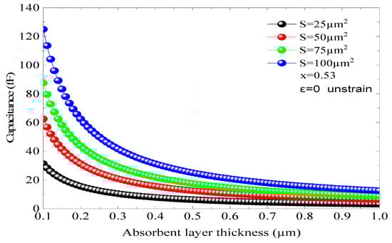 Figure 9 depicts the fc of the adopted p-i-n photodiode based on an InGaAs/InP structure with an absorber region thickness of 0.50 and 1 µm and In concentration (x = 45%) that corresponds to a tensile strain of 0.56% and an α of 5.01 × 104 cm−1. In this structure, the fc at −3 dB is not important compared to the previous results, despite using the same absorbent region thickness (d). For d = 1 µm, the fc is 65.05 GHz, while it reaches 97.85 GHz for d = 0.50 µm, whereas the improvement in the fc at −3 dB is much more significant than those shown in Figure 8 and Figure 9; it reached 8 GHz. The impact of the absorbent region thickness on the fr can be described by the carriers’ τ and the capacitive effect; however, this latter depends also on the junction area. The variation in the capacitive effect as a function of the junction area (S) and d is illustrated in Figure 10 for a stable structure (x = 0.53 and ε = 0). As n, a low capacitive effect is obtained for low areas and thin absorbent regions. For a surface of µm2 and d = 0.50 µm, the capacitance C is equal to 6.25 Fs. Thus, it can be stated that the capacitive effect is limited and does not have an effect on the photodiode performance.