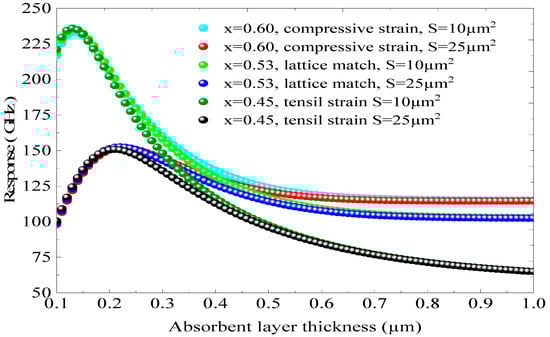 The influence of the thickness of the absorbing layers on the response of the photodiode was examined for different surfaces, with x = 0.53, ε = 0%, and T = 300 K.