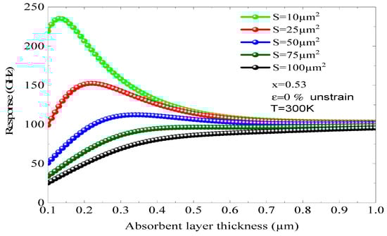 The x begins to appear when using a relatively big area. On the other hand, utilizing a small junction zone along with a thin absorbent layer is vital for the decrease in capacity. The variation in the photodiode response based on the thickness of the absorbing layer is illustrated in Figure 12, taking into account different contact surfaces between the incident photons and the photodiode’s face for x = 0.53 and ε = 0, indicating a mesh-matched and stable design. We note that the increase in the contact surface induces a significant decrease in the maximum response of the component. For a surface S = 10 cm2, the maximum response of the photodiode reaches 235.34 GHz, with an active layer thickness around 0.15 µm. When the surface is equal to 50 cm2, the maximum response of the component decreases rapidly until reaching the value of 112 GHz. Then we note that a degradation of the maximum response of 123 GHz has been reported with an active layer thickness of 0.30 µm, i.e., a decrease of more than 50%. Another phenomenon appearing is the maximum response shifts towards large thicknesses. This analysis provides the opportunity to refine the structure of a compact and ultra-fast optical sensor operating at a response frequency higher than 225 GHz. We find that the maximum response decreases sharply when d is greater than 0.2 µm. To facilitate the operation of a photodiode at frequencies above 200 GHz, an absorbing layer of approximately 0.15 µm must be employed. In addition, it is vital to take into account the phenomenon of structural stability, which directs us to opt for an x equal to 0.53 and a surface area of S = 10 at 25 µm2.