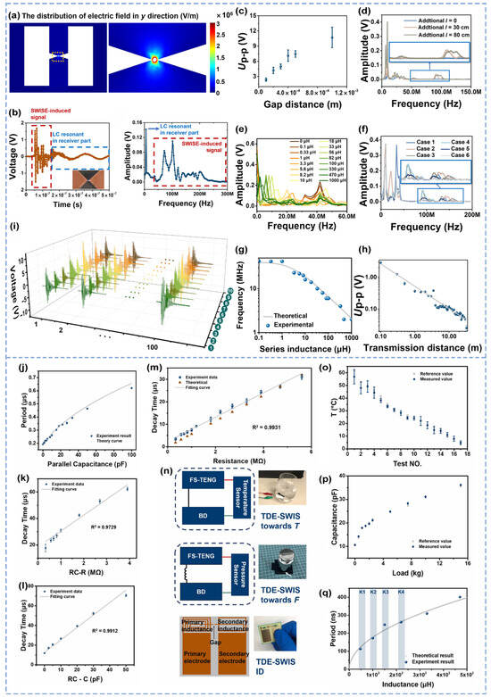 Signal characteristics, parameter coupling, and application verification of the TENG breakdown discharge wireless sensing platform [49,50]. (a) COMSOL simulation analysis of the electric field distribution of the SWISW device in the breakdown state. (b) Time domain and frequency domain signal characterization of the SWISE excitation signal. (c–h) Effects of external factors on the breakdown discharge signal, including (c) discharge tip gap, (d) wire length, (e,g) inductance, (f) spatial conductor distribution, and (h) receiver distance. (i) Signal output of the multigas breakdown dose response. (j) The change in the signal period under the regulation of parallel inductance. (k) Influence of resistance on decay time under resistance-inductance regulation and (l) influence of capacitance on decay time. (m) Variation in attenuation time under the control of series resistance. (n) Commercial sensors and the coupling mode between ID identification and TDE-SWIS. (o) Sensing temperature. (p) Comparison of the sensing weight with the reference value. (q) Comparison between the signal periods of components with different inductors and the theoretical values for ID identification.