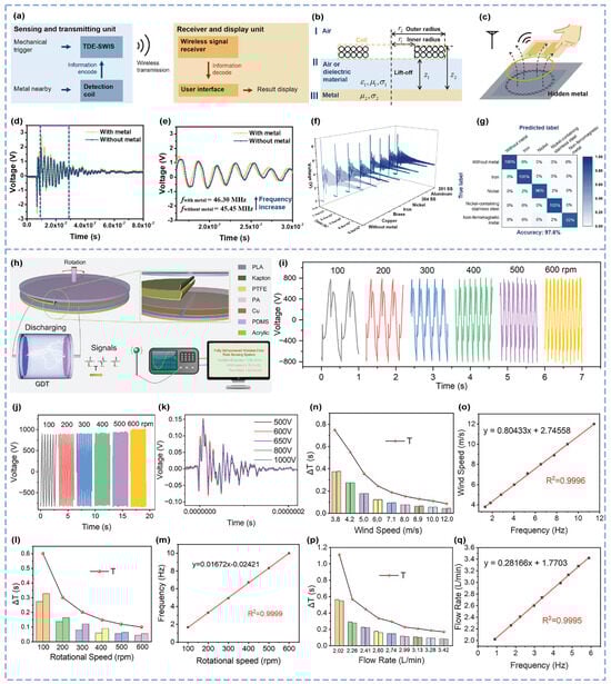 A self-powered wireless metal detector combining a CNN and a fluid mechanics-oriented self-powered wireless sensor flowmeter [59,60]. (a) SWMD device workflow and receiving system. (b) Physical model of the eddy current coil for metal detection. (c) Mechanistic demonstration based on the eddy current reverse magnetic field cancellation effect. (d) Contrast analysis of the received signal when the metal is static and (e) local enlargement of the picture. (f) Polymetallic TDE-SWIS time domain signal and (g) CNN metal classification confusion matrix. (h) Schematic diagram of the R-Teng structure and signal transmission process. (i) Voltage characteristics of GDT breakdown at different rotating speeds. (j) Voc of the R-TENG at different speeds. (k) Time domain diagram of signals generated by different Voc values during breakdown discharge at 400 V GDT. Linear relationship between (l) ΔT and (m) frequency with the speed of continuous discharge at different speeds. Linear relationship between (n) ΔT and (o) frequency with the flow rate of continuous discharge for gas fluid sensing. Linear relationship between (p) ΔT and (q) frequency with the flow rate of continuous discharge for liquid-fluid sensing.