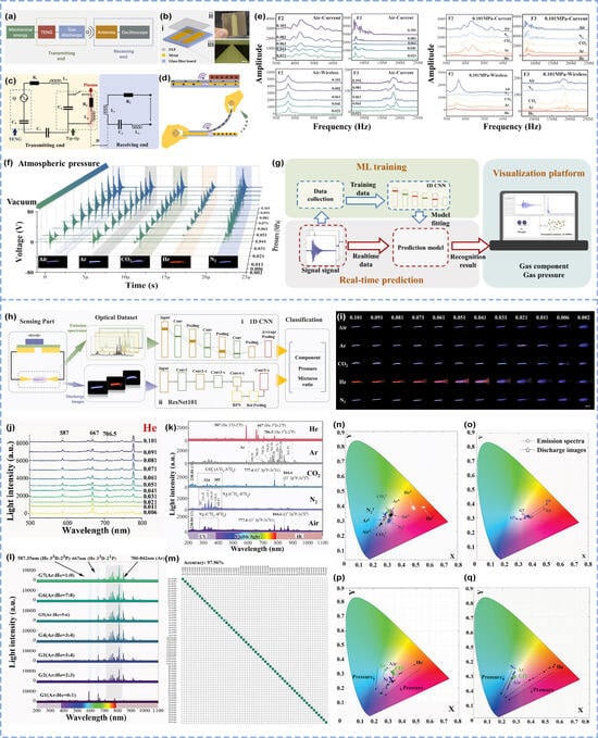 TENG breakdown discharge gas sensing via electromagnetic signal analysis and optical emission analysis [61,62]. (a) Self-driving wireless electronic nose system framework. (b) Structure diagram of the integrated transmitting unit: i. The structure diagram. ii. The physical image. iii. The enlarged image of the discharge tips. (c) Equivalent circuit model of the wireless sensor system. (d) Schematic diagram of the sliding mode and peeling mode of the integrated transmitter. (e) Current signal and wireless signal in the sensing characteristic frequency domain in the air pressure identification and atmosphere identification modes. (f) Some 3D images of typical wireless signals of triboelectric discharge in 60 different atmospheres. (g) Working process of machine learning gas identification. (h) Workflow of light emission gas sensing. (i) Friction-induced discharge images at different atmospheres and pressures. (j) Emission spectra of He gas discharge at different pressures. (k) Emission spectra of gas discharges in different atmospheres. (l) Emission spectrum of mixed gas discharge. (m) Identification confusion matrix for 60 kinds of gas environment based on the emission spectrum. (n) CIE XY chromaticity diagram of discharge for different gas types. (The five-pointed star with “S” is the spectral data, and “I” is the image data.) (o) CIE XY chromaticity diagram of discharge under different gas mixture ratios. (Empty dots and black dotted lines are spectral data, and hollow five-pointed stars and blue dotted lines are image data.) (p) CIE XY chromaticity diagram of discharge images under different air pressures. (q) CIE XY chromaticity diagram of the discharge emission spectrum under different air pressures.