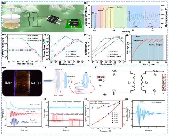 The Teng-driven tip electrode air discharge switch was used in meteorological sensing, and high-signal-density wireless sensing coupled with a coil was used [58,63]. (a) Schematic diagram of a self-driven wireless weather sensing system equipped with a tip electrode air discharge switch. (b) Measurement results of the output current and voltage increasing with the discharge gap (1.8–5.0 mm). (c) Instantaneous output current; (d) peak power value; (e) output energy per cycle. (f) Curve of the 44-MF capacitor charging wireless weather sensing system in PMC mode. (g) Discharge photos of the HSD sensor during operation. (h) Schematic diagram of the shielding detection of primary coil #1 in the air breakdown state. (i) Equivalent circuit model of a wireless transmission scheme integrating a TENG and a pair of induction coils. (j) Signal details of three detection modes: probe suspension, probe connected to a single coil, and probe connected to a secondary coil pair at a detection distance of 20 cm. (k) Comparison of the signal density between traditional wireless TENG sensors and HSD sensors. (l) Signal density (black broken line) and signal count per unit time (red broken line) of the equipment at a driving frequency of 0.5–1.0 Hz. (m) The image received by the oscilloscope at the receiving end at a driving frequency of 1 Hz, a pressure of 40 N, and a distance of 100.69 m.