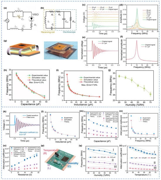 A laminated TENG with an integrated sensing module and breakdown discharge tip and a dual-mechanism sensing scheme based on the frequency and attenuation coefficient [64,65]. (a) Circuit model of the wireless sensor. (b) Circuit model of the receiver. (c) Time and (d) frequency domain diagrams of signals measured by an oscilloscope with different inductances. (e) Time and (f) frequency domain diagrams of the original signal and the received signal with a 0.1 μH inductance. (g) Structural schematic and photograph of the wireless humidity sensor. (h) Relationship between the base frequency and series inductances. (i) Relationship between the base frequency and parallel capacitance. (j) Relationship between the base frequency and humidity. (k) Fitting results of the attenuation coefficient for a typical wireless signal. (l) Relationships between the base frequencies and series inductances. (m) Relationships between the base frequencies and series capacitances at 1, 3.3, and 8.2 μH. (n) Relationships between the attenuation coefficients and series inductances. (o) Relationships between the base frequencies and series resistances at 1, 3.3, and 8.2 μH. (p) Photograph of the PCB-based multiparameter sensing module. (q) Base frequency versus humidity curves of wireless signals with different series inductances. (r) Attenuation coefficient versus temperature curves of wireless signals with different inductances.