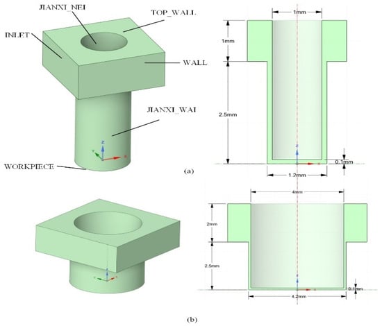 Geometric model of the interelectrode gap flow field: (a) diameter = 1 mm; (b) diameter = 4 mm.