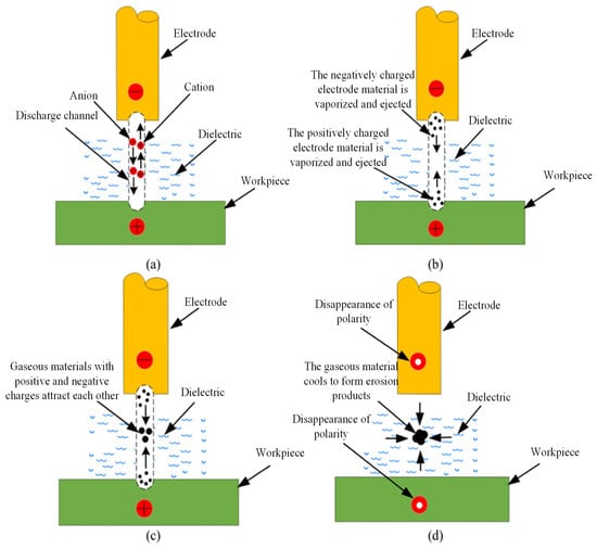 Schematic diagram of the microscopic process of EDM. (a) A discharge channel is formed between electrodes by applying discharge pulses; (b) electrode surface material melts and vaporizes; (c) eroded material accumulates within the discharge channel; (d) vaporized products converge and form removal debris.