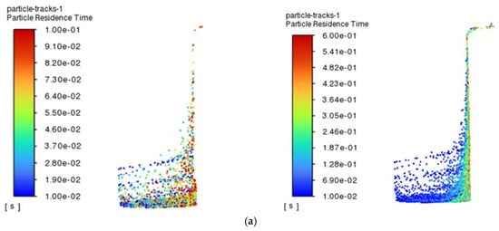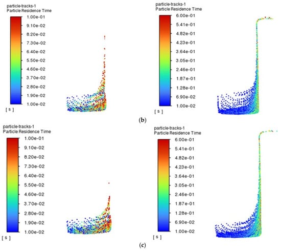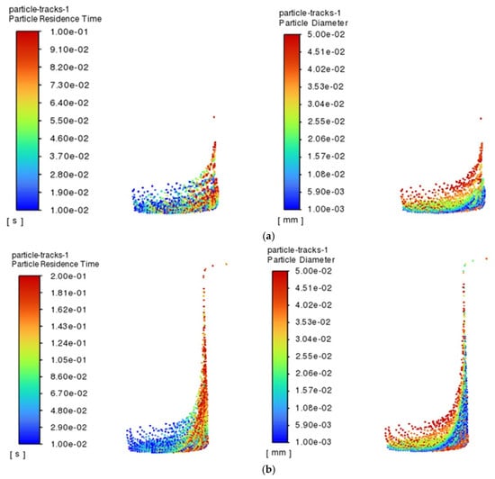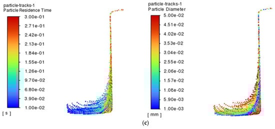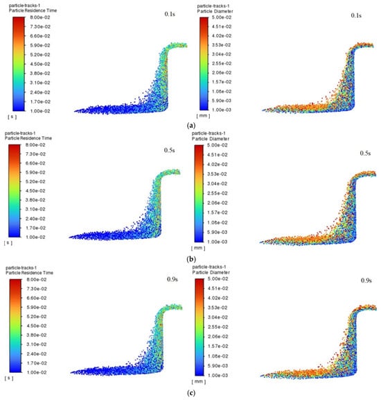 When processing a hole with a diameter of 1 mm, the escape rate of particles shows a trend of increasing and then stabilizing, and the escape rate of particles is at the lowest level at the beginning of processing, when most of the particles generated during processing are still retained in the hole because the hydrodynamic conditions have not yet been established completely. With the passage of time, the flow field inside the hole gradually evolves, and the escape rate gradually rises, reaching the highest value at 0.6 s, after which the trend tends to stabilize gradually. In order to deeply analyze the behavioral characteristics of the particles in the holes, the particles in the time period of 0.1~0.3 s are selected for the analysis, as depicted in Figure 5, which shows the residence time and size distribution of the particles in the canola oil renewable dielectrics in 1 mm holes in the time period of 0.1~0.3 s. The analysis results show that the average residence time of the particles is decreasing with the increase in time, and this phenomenon may be caused by the evolution of the flow field in the hole, which makes the particles escape more easily under the force. In addition, further analysis of the particle sizes as well as their residence times reveals that large-sized particles are the first to escape, while small-sized particles are more likely to be retained near the hole wall. Large particles, due to their larger mass, are able to break through the fluid resistance into the main flow zone faster under the effect of inertia, thus leaving the hole faster.