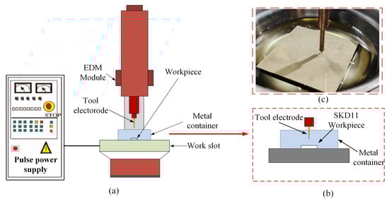 In this experiment, a metal container was used to hold the renewable dielectrics, and the SKD11 to be processed was put into the metal container, and the scale of the SKD11 workpiece used for the experiment was 80 mm × 80 mm × 30 mm. The experimental setup is shown in Figure 8, in which the electrodes are shaped as a conical tool and made of copper material; the diameter (small end face) of this conical electrode is 1000 μm, and the taper difference is 1°. The main reason for choosing copper as the material for the tool electrode is its superior machining properties. Firstly, copper has a low-tool-wear ratio, which helps to increase the service life of the electrode. Secondly, the excellent electrical conductivity of the copper material facilitates stable energy transfer during the EDM process. Finally, in this study, optical microscopic measurements of the machining characteristics after EDM drilling were carried out using a Leica DVM6 super-depth-of-field microscope, which is characterized by a high resolution and large depth-of-field and is able to clearly capture the surface morphology and machining characteristics of the microstructures.