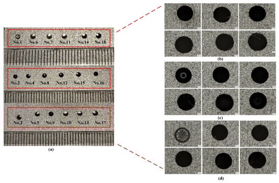 In order to study the machinability of drilling micro-holes in SKD11 using renewable dielectrics in electric discharge machining, the machining performance was experimentally investigated under a different current, pulse width, and pulse interval. Given that this study employed industrial-grade high-precision experimental equipment, the obtained data possess high accuracy and reliability. Meanwhile, considering the substantial processing costs associated with each experimental condition, only a single experiment was conducted for each test scenario. The machined experimental samples are shown in Figure 9. To ensure the accuracy of the data, eight diameter measurements were taken for each hole machined after the experiments using an ultra-depth-of-field microscope to collect the measured data, and the values of the machinability performance are shown in Table 6, where the values of the sunflower seed oil renewable dielectric, canola oil renewable dielectric, and soybean oil renewable dielectric are denoted by numbers 1, 2, and 3, respectively. The EDM input process parameters such as current, pulse width, pulse interval, and dielectric are selected to study the effect of these parameters on MRR, overcut, edge deviation, and EEV.