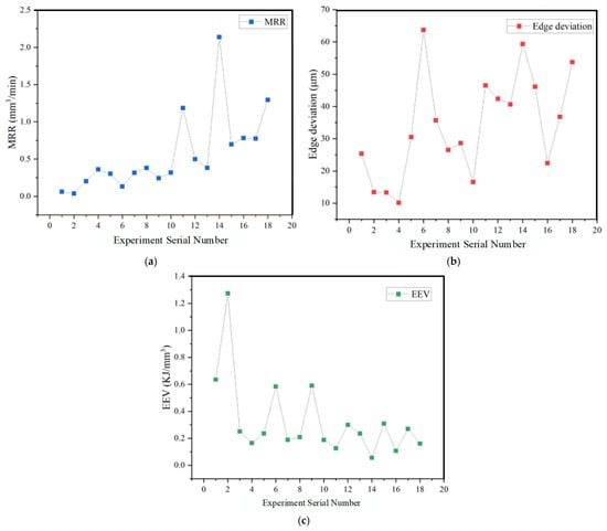 Results of EDM SKD 11; (a) MRR, (b) Edge deviation, (c) EEV.