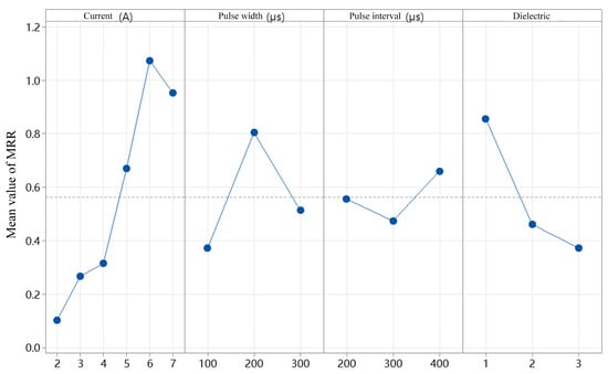 Main effect plot of mean MRR under different currents, pulse durations, pulse intervals, and dielectric fluid conditions.