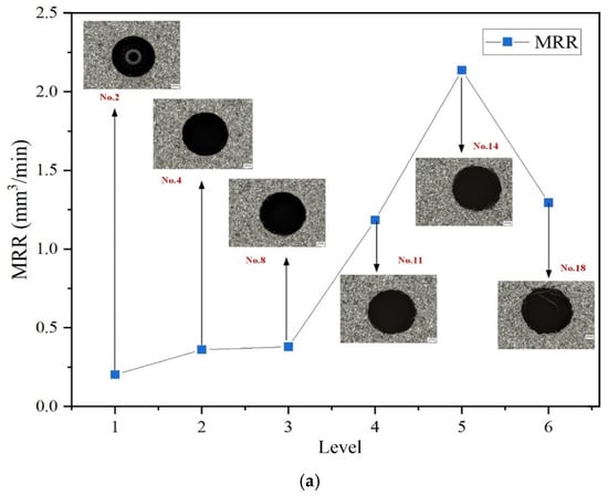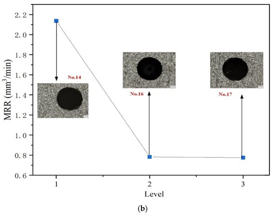 Figure 12 illustrates the optimal MRR performance under the two most influential factors—current and dielectric fluid—as determined by the ranking analysis. Figure 12a shows the optimal MRR performance across different current levels. The best MRR value is obtained at a current of 6 A, which can be attributed to the increased energy released during pulse discharge with the higher current. Under the effect of instantaneous high temperature, the surface material of the workpiece rapidly melts or even vaporizes. Meanwhile, the dielectric fluid in the discharge channel rapidly vaporizes and expands due to the heat, exerting an impact force on the molten material on the workpiece surface, thereby accelerating the material removal process. Figure 12b displays the optimal MRR performance across different dielectric fluids. The highest MRR value is achieved when sunflower seed oil, a renewable dielectric, is used for EDM drilling. In contrast, the average MRR values obtained with canola oil and soybean oil are comparatively lower and showed little difference between them. Among the six current levels, the top three performing conditions in terms of MRR all use sunflower seed oil as the dielectric. Furthermore, in the experiments that yielded the best results, a pulse duration of 200 μs is selected in half of the cases. From the perspective of both current and dielectric fluid, Experiment No. 14 achieved the highest MRR, with an input current of 6 A, a pulse duration of 200 μs, and the use of sunflower seed oil as the dielectric. This indicates that employing a high current, short pulse interval, and a low-viscosity dielectric fluid is more conducive to effective material removal.