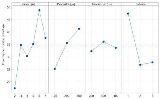 Main effect plot of mean edge deviation under different currents, pulse durations, pulse intervals, and dielectric fluid conditions.