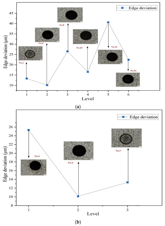 A smaller edge deviation indicates higher machining quality. Figure 14a,b illustrate the influence of the discharge current and dielectric fluid, respectively, on edge deviation in small-hole EDM. First, from the perspective of discharge current, lower current levels result in reduced edge deviation. When the current is set to 3 A, the edge deviation of the machined holes is minimized, indicating improved machining performance. A lower current ensures a more stable discharge process, thereby enhancing machining quality. This is primarily because a reduced discharge current leads to smaller energy fluctuations, stabilizing the process and mitigating issues such as excessive erosion or non-uniform localized discharges caused by high currents. Secondly, regarding the dielectric fluid, as shown in Figure 14b, when canola oil is used as the renewable dielectric, the edge deviation is further reduced. This improvement is mainly attributed to the relatively high viscosity of canola oil, which exceeds that of the other two dielectrics considered. In small-hole EDM, a high-viscosity dielectric not only enhances debris removal efficiency but also effectively suppresses random arc deflection, leading to more uniform and controllable discharges. Consequently, this reduces material removal non-uniformity and machining errors. Moreover, higher viscosity improves the dielectric’s cooling capacity, thereby limiting the extension of the heat-affected zone and further optimizing the overall machining quality.