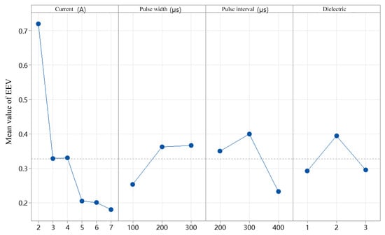 Main effect plots of average EEV under different discharge currents, pulse durations, pulse intervals, and dielectric fluids.