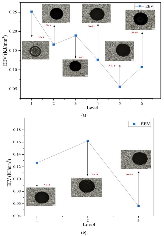 A lower EEV indicates that less energy is required to remove the same volume of material, implying higher machining efficiency. Figure 16 illustrates the influence of discharge current and pulse duration on EEV in EDM hole machining. The EEV value generally decreases with increasing current, signifying improved efficiency. The optimal EEV is achieved at a discharge current of 6 A, where the lowest energy consumption per unit volume is observed.