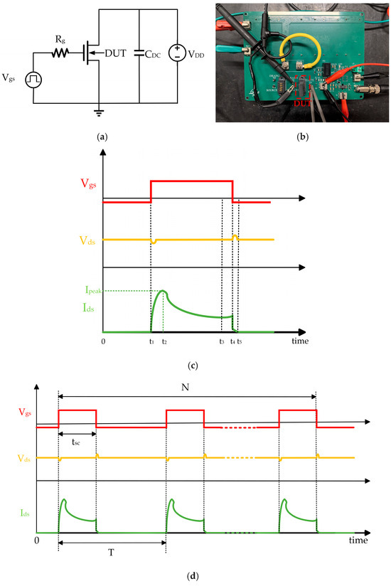 Short-circuit test of 4H-SiC power MOSFET: (a) schematic circuit of SC test; (b) SC test setup; (c) wave form diagram of single short-circuit test; and (d) wave form diagram of repetitive short-circuit test.