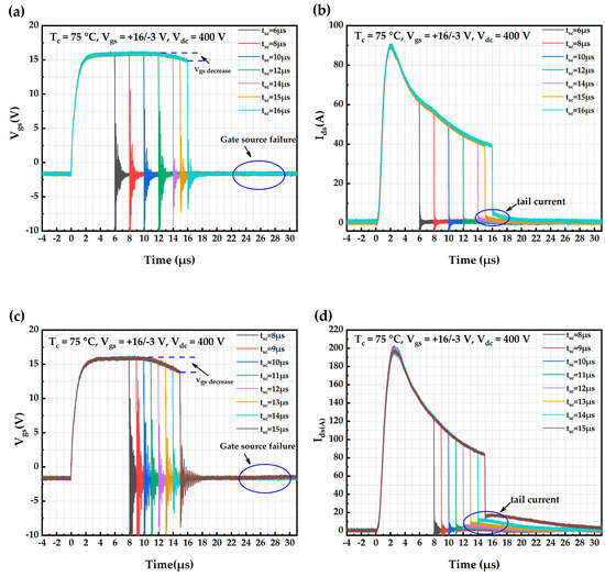 The short-circuit test plot of the AT-MOSFETs and DT-MOSFETs at a room temperature of 25 °C, voltage source of 600 V, and gate-source voltage of 15 V/−3 V is shown in Figure 8. Figure 8a,c show the last test waveform graph before failure, and Figure 8b,d show the failure waveform. The black waveform in the figure is the short-circuit current, the red waveform is the gate-source voltage, and the blue waveform is the drain-source voltage. In Figure 8a, the drain-source current rises rapidly to 78.9 A after the AT-MOSFETs are turned on, and then the current begins to drop. As the short-circuit time increases, the gate voltage appears to drop. When the device is turned off at the 11th μs, the gate voltage drops by 0.6 V and the trail current is 6.59 A. The drain-source voltage spikes during device turn-on and turn-off due to the presence of stray inductance in the power loop. In Figure 8b, as the short-circuit time increases, the current first rises to the peak short-circuit current and then begins to decrease, with the increase in short-circuit current occurring after the 11th μs. When the device is turned off, the gate voltage drops by 1.2 V at the 12th μs, which is an increase over the pre-fault short-circuit stress. The trail current is 12.35 A, which is also an increase over the pre-failure short-circuit stress. After the device was turned off for 3.9 μs, the current increased dramatically, and at the same time, the device gate was out of control, and the drain-source voltage gradually dropped to 0 V, indicating that the device lost its blocking capability, which is a typical thermal runaway failure. The maximum short-circuit withstand time of the AT-MOSFETs under this short-circuit stress is thus obtained to be 12 μs.