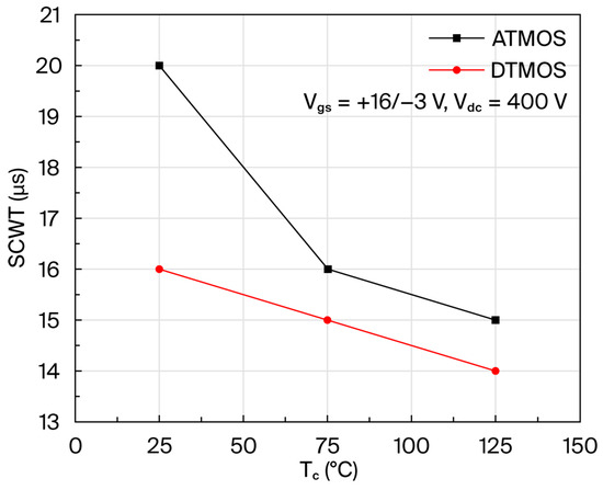 Figure 6 shows the maximum short-circuit withstand time for AT-MOSFETs and DT-MOSFETs at a drain-source voltage of 400 V and a gate-source voltage of 16 V/−3 V at case temperature. As the ambient temperature increases, the device junction temperature is higher, resulting in the device being more likely to reach the failure threshold junction temperature, resulting in device failure, and thus having a shorter ultimate short-circuit withstand time. The short-circuit reliability of AT-MOSFETs is also better than DT-MOSFETs, even at high temperatures [18].