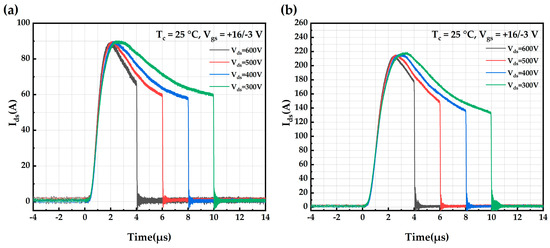 Short-circuit waveforms of trench-type SiC MOSFETs at different drain voltages: (a) AT-MOSFETs; (b) DT-MOSFETs.