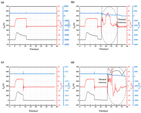Short-circuit waveforms for AT-MOSFETs and DT-MOSFETs at drain voltage 600 V and gate voltage 15 V: (a) before failure waveform of AT-MOSFETs; (b) failure waveform of AT-MOSFETs; (c) before failure waveform of DT-MOSFETs; and (d) failure waveform of DT-MOSFETs.
