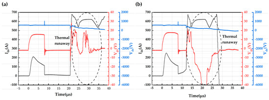 The device exhibits a thermal runaway failure under all three stresses. Figure 9 shows the short-circuit failure waveforms of the DT-MOSFETs at a drain voltage of 600 V and gate voltages of 16 V and 18 V. The gate voltage decreases by 0.8 V when the device is turned off at the 8th μs in Figure 9a, which is an increase from the pre-failure short-circuit stress. The tail current is 12.7 A, which is also increased from the pre-failure short-circuit stress, and the trail current lasts until 20.8 μs. In Figure 9b, the gate voltage decreases by 2.0 V when the device is turned off at 8 μs, which is increased from the pre-failure short-circuit stress. The tail current is 22.6 A, which is also increased from the pre-failure short-circuit stress, and the trail current continues to increase up to 12 μs, which is different from the gradual decrease in the trail current under low gate voltage stress. The current increases sharply after the device is turned off for 4 μs, while the device gate is out of control, and the drain-source voltage gradually decreases to 0 V [11].