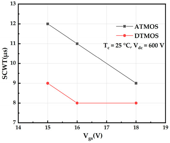 Figure 4 shows the maximum short-circuit withstand time of AT-MOSFETs and DT-MOSFETs at the room temperature of 25 °C and the drain-source voltage of 400 V under different gate drive voltages. As the gate voltage increases, the peak short-circuit current of the device increases, leading to an increase in the energy dissipated in the device; further, the junction temperature rises faster, and failure is more likely to occur, thus having a shorter ultimate short-circuit withstand time. It has also been found that the short-circuit reliability of DT-MOSFETs is weaker than that of AT-MOSFETs [17].