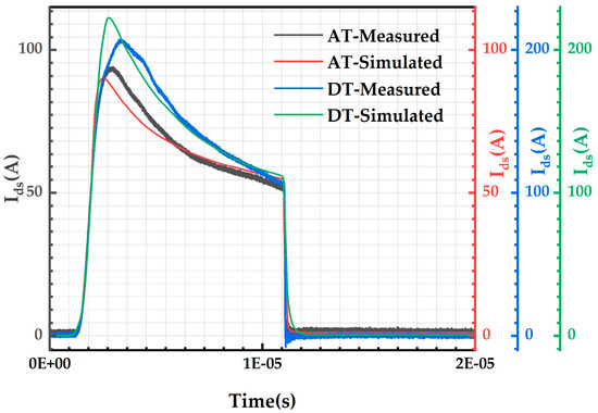 For the AT-MOSFETs, the gate-source voltage of 16 V, the drain-source voltage of 400 V, the temperature of 300 K, and the short-circuit time of 10 μs are selected, and the fitted single short-circuit experimental current waveforms are shown as the red and black waveforms in Figure 11. For DT-MOSFETs, the same simulation conditions as AT-MOSFETs and a short-circuit time of 10 μs are chosen, and the fitted single short-circuit experimental current waveforms are shown as the blue and green waveforms in Figure 11. From the comparison graph of experimental waveforms and simulation results, it can be seen that the two are in good agreement; although there are differences, the overall trend is similar, and this can be used as a general case study. Based on this model, we observe the effect of different test conditions on the distribution of the internal electrical and thermal parameters of the device and analyze the reasons for the failure of the device.