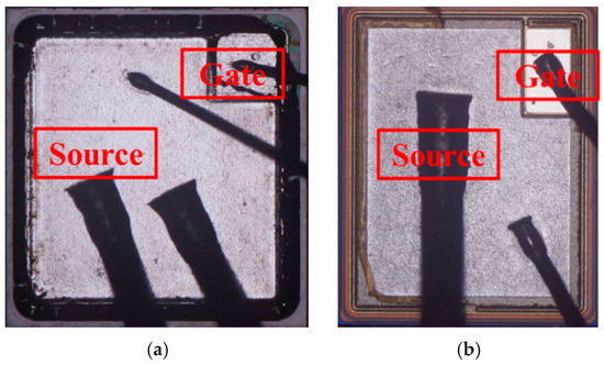 Figure 14 shows the depackaged plots of two trench-type devices after a short-circuit failure at a 400 V drain-source voltage, as evidenced by the gate failures labeled in Figure 3a,c. The trend is insignificant for Vgs of 15 V, but there is a clear trend in the gate voltage from 3 V to 0 V for the 18 V gate failure. There are almost no visible burnt spots on the chip surface, which is consistent with the impedance values tested after the experiment and also indicates that the gate damage occurs in the internal gate oxide layer of the device [24]. Upon the arrival of the short-circuit condition, the increased junction temperature of the device leads to an increase in the thermal stress between the aluminum metal and the gate oxide layer. When the electro-thermal stress reaches the tolerance limit of the gate oxide, it leads to SiO2 cracking. As the short circuit progresses, after the temperature continues to rise and is sufficient to melt the aluminum metal, the molten aluminum penetrates into the gate oxide cracks, causing the gate source to fail [20]. The device short-circuit tolerance time is longer, and the temperature rise is slower at bus voltages with less stress, and the final temperature is not sufficient to generate a large number of electron–hole pairs, causing thermal runaway and exhibiting a gate failure mode [25].