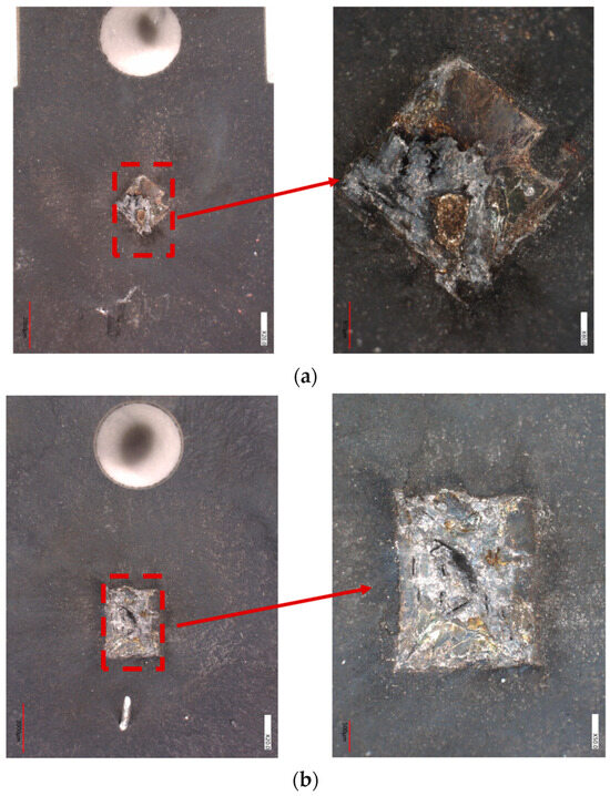 A surface view of two trench-type devices after short-circuit failure at the 600 V drain-source voltage is shown in Figure 15. This failure corresponds to the thermal runaway labeled in Figure 8b,d and Figure 9, as well as the tail current observed in the curves. The entire active region is severely burned, and the bonding wires are completely melted. Under a short circuit with a high drain-source voltage, a sharp temperature rise occurs inside the chip within only a few μs, and the high temperature leads to the generation of carriers in the drift region to form a tail current [26]. The high voltage and high temperature generate a large number of electron–hole pairs, which in turn increase the current density, causing the temperature of the device to continue to rise, and ultimately leading to thermal runaway failure, which is manifested by the trench-type device exploding during the experiment, with all of the aluminum metal on the surface of the chip melting and burning.