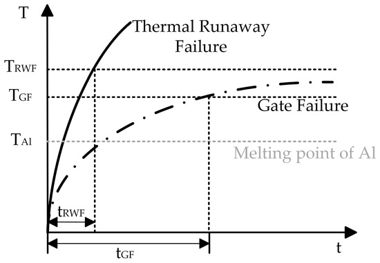 The failure mechanism of trench-type devices under different short-circuit conditions is shown in Figure 16. When the junction temperature rises faster, generating a large number of carriers leads to an increase in the positive feedback of the current and temperature, which ultimately results in the thermal runaway failure of the device, and this critical temperature is referred to as TRWF. However, when the junction temperature rises slowly, there is enough time to build up electro-thermo-mechanical stresses, and once the temperature is high enough (TGF) to melt the Al, the melted Al gets into the broken oxide layer and causes the gate to short out. TAl in the figure is the critical temperature for Al melting.