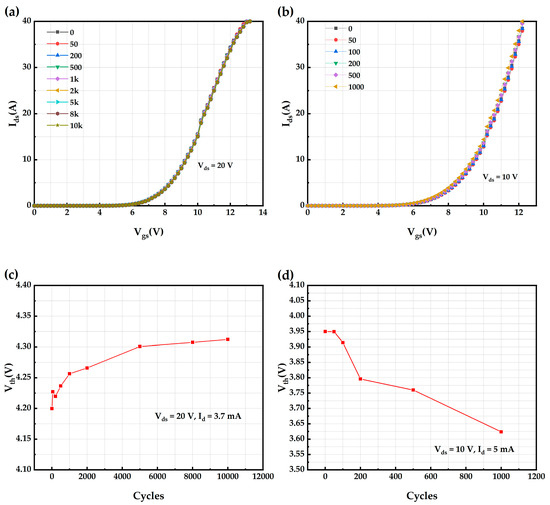 AT-MOSFETs and DT-MOSFETs under 5 μs short-circuit pulse: (a) transfer characteristics of AT-MOSFETs; (b) transfer characteristics of DT-MOSFETs; (c) Vth of AT-MOSFETs; and (d) Vth of DT-MOSFETs.