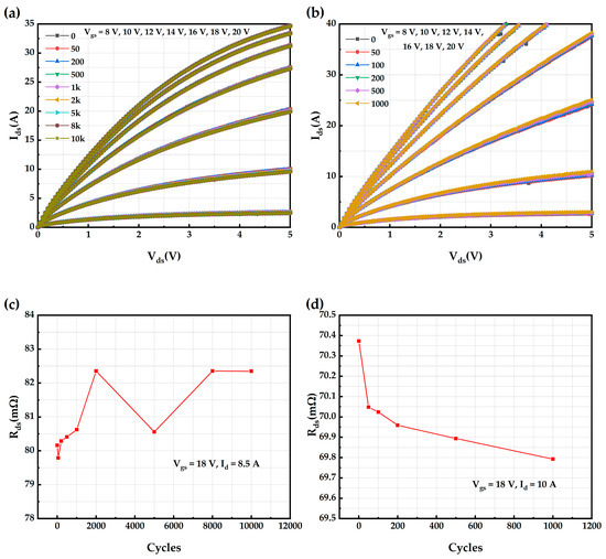 The variation in the output characteristic curve of the AT-MOSFET under a repetitive short-circuit test with 5 μs short-circuit pulses is shown in Figure 18a. From this, it can be observed that the output curve shifts slightly downward as the number of short-circuits increase. Figure 18c shows the variation in the on-resistance Rds of the AT-MOSFETs (extracted at Vgs = 18 V, Id = 8.5 A, Tc = 25 °C), with the number of short-circuits. The on-resistance also shows an overall increasing trend with the increase in short-circuit stress, from an initial 80.16 mΩ to 82.35 mΩ. This is due to an increase in Vth, a decrease in the effective repetitive voltage applied to the device channel, and a downward shift in the output characteristic curve [33]. Meanwhile, the output characteristic curve of the DT-MOSFETs under short-circuit tests with 5 μs short-circuit pulses changes, as shown in Figure 18b. It can be seen that the output curve variation is the same as that of the AT-MOSFETs, and the on-resistance decreases gradually. Figure 18d shows the variation in the on-resistance Rds of the DT-MOSFETs (extracted at Vgs = 18 V, Id = 10 A, and Tc = 25 °C) with the number of short circuits. The Rds gradually decreases with the increase in short-circuit stress, from the initial 70.37 mΩ to 69.79 mΩ. This is due to the decrease in the Vth, which results in an increase in the effective voltage applied to the device channel, and is the result of the upward shift of the output characteristic curve [33,34].