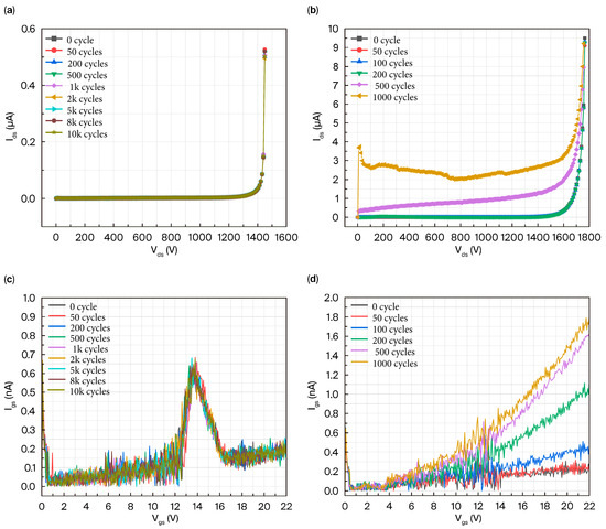 AT-MOSFETs and DT-MOSFETs under 5 μs short-circuit pulse: (a) blocking characteristics of AT-MOSFETs; (b) blocking characteristics of DT-MOSFETs; (c) Igss of AT-MOSFETs; and (d) Igss of DT-MOSFETs.
