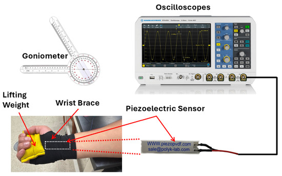 Schematic of the experimental setup showing the custom-fabricated smart wrist brace with integrated piezoelectric sensor, goniometer for angular calibration, and oscilloscope for real-time voltage signal monitoring during wrist movement under load. The white dashed line serves only as a visual indicator of the piezoelectric sensor’s location within the wrist brace.