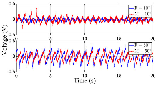 Sample of the time-domain voltage signals under no loading conditions from male and female participants at wrist angle (top) and wrist angle (bottom).
