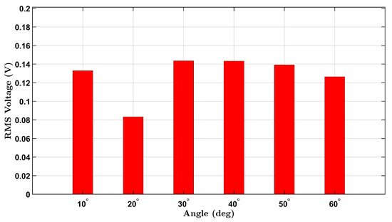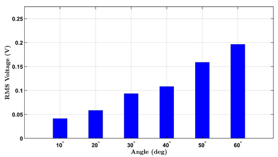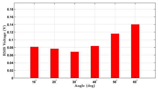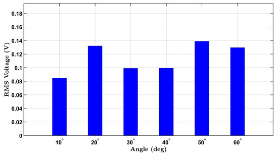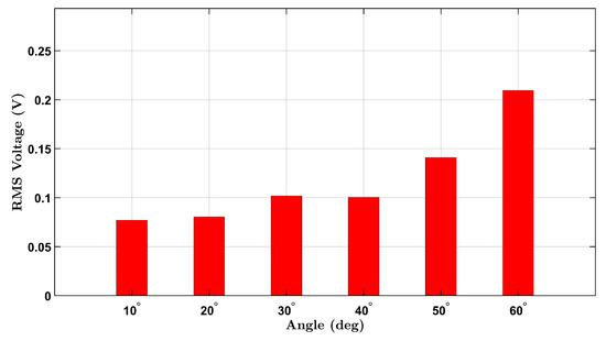 Similarly, the male participant’s results are shown in Figure 4. A comparable upward trend is seen across the six angles, with slightly higher RMS values overall. This may reflect differences in wrist size, muscle stiffness, or motion dynamics between participants. The observed voltage trends align with the expected behavior of piezoelectric materials under mechanical bending and demonstrate the device’s capability to detect strain amplitude through voltage generation.