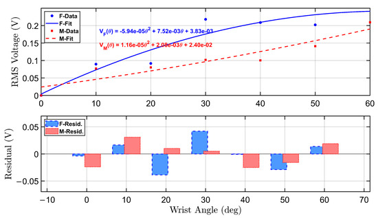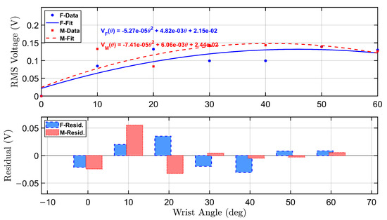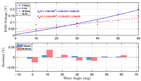 Figure 5 presents the calibration and residual analysis for both female and male participants under the no-load condition. The top panel displays second-order polynomial fits of the RMS voltage as a function of wrist angle, derived from empirical data collected during repeated flexion trials targeting angles from to .