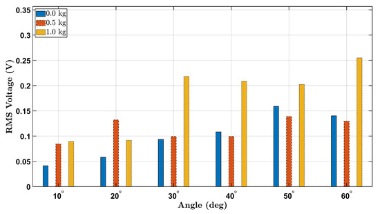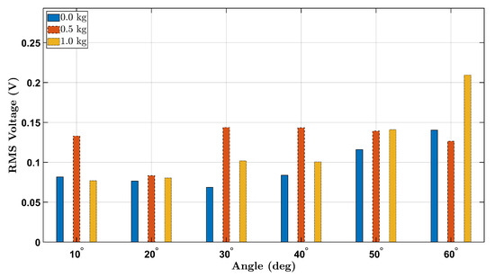 To further clarify the effect of external load on piezoelectric sensor output during wrist flexion, Figure 12 and Figure 13 present consolidated bar plots comparing the RMS voltage values for all three tested loads (0 kg, 0.5 kg, and 1.0 kg) across the six wrist flexion angles for the female and male participants, respectively.