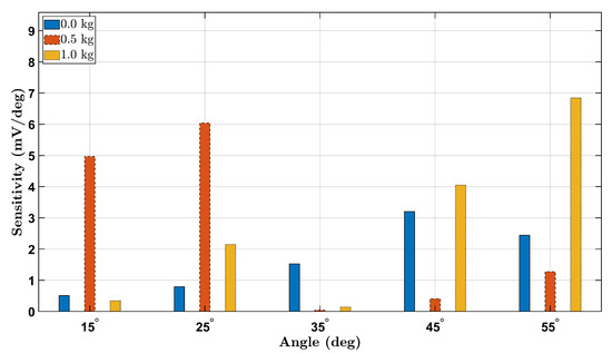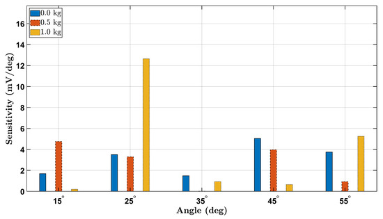The sensitivity trends reveal a general increase with load magnitude, highlighting the sensor’s enhanced response to higher mechanical strain. For both participants, sensitivity was highest at larger angles under the 1.0 kg load, confirming improved voltage resolution at elevated deformations. Notably, the female participant exhibited higher overall sensitivity values compared to the male, potentially due to anatomical and biomechanical differences. These findings demonstrate that the Smart Wrist Brace effectively amplifies signal detection with increasing wrist flexion and external loading, reinforcing its potential for dynamic monitoring of joint mechanics.