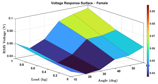 To comprehensively visualize the combined effects of wrist flexion angle and external load on the voltage output of the smart wrist brace, 3D surface plots were generated for both female and male participants. These plots illustrate the RMS voltage response as a function of wrist angle () and load (0, 0.5, and 1.0 kg), capturing the continuous and interactive relationship between these two parameters.
