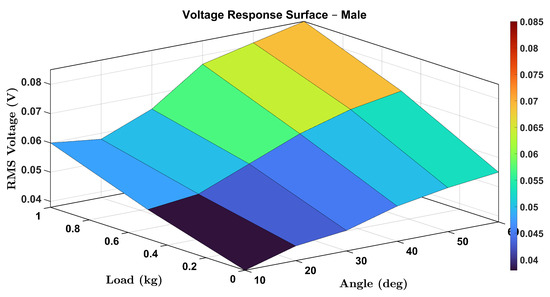 Similarly, Figure 17 presents the male participant’s response surface. While the general trend remains consistent, voltage rising with both load and angle, the rate of increase appears slightly lower than in the female case, which could be attributed to physiological differences in muscle stiffness, wrist geometry, or skin elasticity.