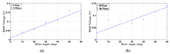 where and represent the female and male voltage outputs in volts, and is the wrist angle in degrees. Also, and represent the sensitivity coefficients (in V/deg) for the female and male participants, respectively, indicating the rate of change in voltage output with respect to wrist angle. The constants and denote the voltage offsets at zero angle, capturing any baseline voltage present due to sensor pre-strain, system bias, or fabrication inconsistencies. These coefficients were obtained through linear regression of experimental data collected under the no-load condition.