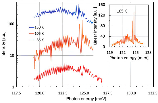 Experimental results of a slightly detuned InGaAs/InAlAs-based QC-DFB laser working at roughly 125 meV (1000 cm−1, 10 µm) at device temperatures of 85 K, 105 K, and 150 K. By changing the device temperature, the semiconductor gain peak of this QC structure tunes its spectral position (121.26, 122.13, 122.50 meV (~988 cm−1)) more rapidly than the Bragg resonance (123.25, 123.62, 123.74 meV (~998 cm−1)). Therefore, an increasing amount of asymmetry is seen at higher temperatures. The inset shows the 105 K-curve in linear scale—thus even better highlighting the spectral asymmetry.