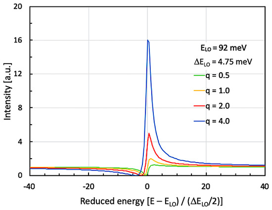 Numerically computed Fano resonance curves for different asymmetry parameters ‘q’. In agreement with the experimentally observed parameters, the GaN-based LO-phonon resonance is located at ELO = 92 meV (741 cm−1) and has an FWHM of (ΔELO = 4.75 meV (38 cm−1). The graphs correspond to Fano resonance curves defined by σ(ε) = σ0 (q + ε)2/(1 + ε2) with the ‘reduced energy’ ε = (E − ELO)/(ΔELO/2) and σ0 being a constant set to σ0 = 16.