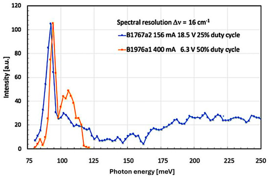 Concerning the spectral differences in the smaller, secondary maximum of the broad luminescence peak (located close to the spectral minimum at 120 meV (960 cm−1) for both B1767a2 and B1976a1), we find several possible explanations. First of all, the electrical pump conditions, such as current, voltage, and duty cycle, were not at all identical for the two samples. But even more important is the fact that—as a second point—the mounting of the processed semiconductor chips using a thin [In] foil pressed onto a copper heatsink was not such a well-controlled and established standard procedure. This resulted, without any doubt, in slightly different device temperatures. These multiple factors can, therefore, easily explain the observed small energy difference.