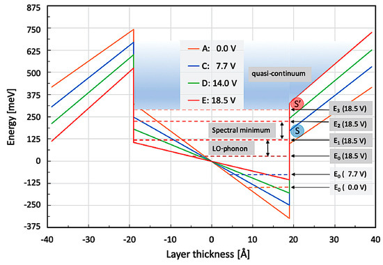 In the following paragraph, we are going to perform some numerical simulations to better understand the experimentally observed external screening of the internal polarization fields. Figure 5 shows the main 38 Å QW of structure B1767a2 alongside its most important bound energy levels under various externally applied bias voltages. As presented in Figure 4, the most important features are the energy difference between E0 and E1 (becoming resonant to the LO-phonon at 18.5 V), the spectral minimum between 125 meV and 200 meV (being found in the emission spectrum in Figure 4), and the quasi-continuum starting from E2/3. This quasi-continuum is due to several closely lying, broadened, and thus overlapping subband states in the triangularly shaped QW starting already above 175 meV at 7.7 V but only above 275 meV at 21.5 V. On the energy scale used in Figure 5 (measured from the center of the active QW) and at a small applied voltage of 7.7 V, the right barrier is obviously much lower than with a large bias voltage of 18.5 V. The concomitant screening of the internal electric polarization fields leads to the occurrence of a spectral asymmetry at considerably smaller energy—in agreement with the asymmetric emission spectra ‘B’, ‘C’, and ‘D’ shown in Figure 3.